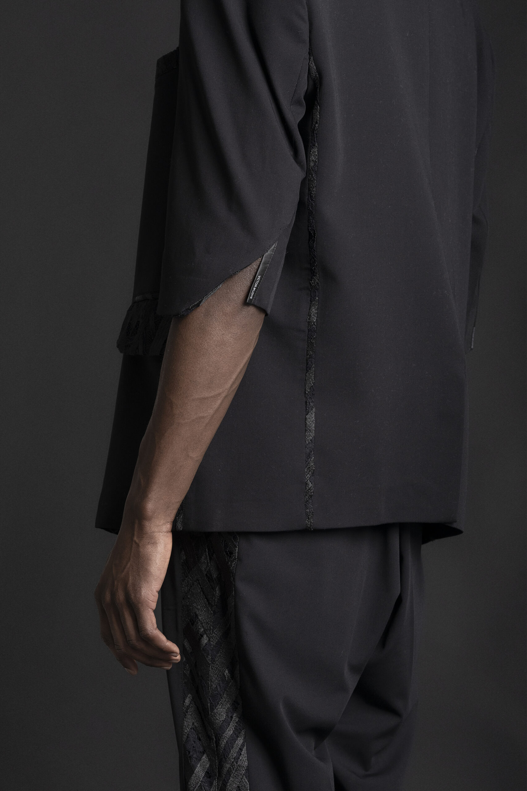 Experience unparalleled luxury with this black lace offense suit blazer. The short-sleeved design features a chest welt pocket, double-breasted button fastening, and two front flaps.Delicate lace details elevate the blazer to a new level of sophistication, making it the perfect choice for any formal occasion.