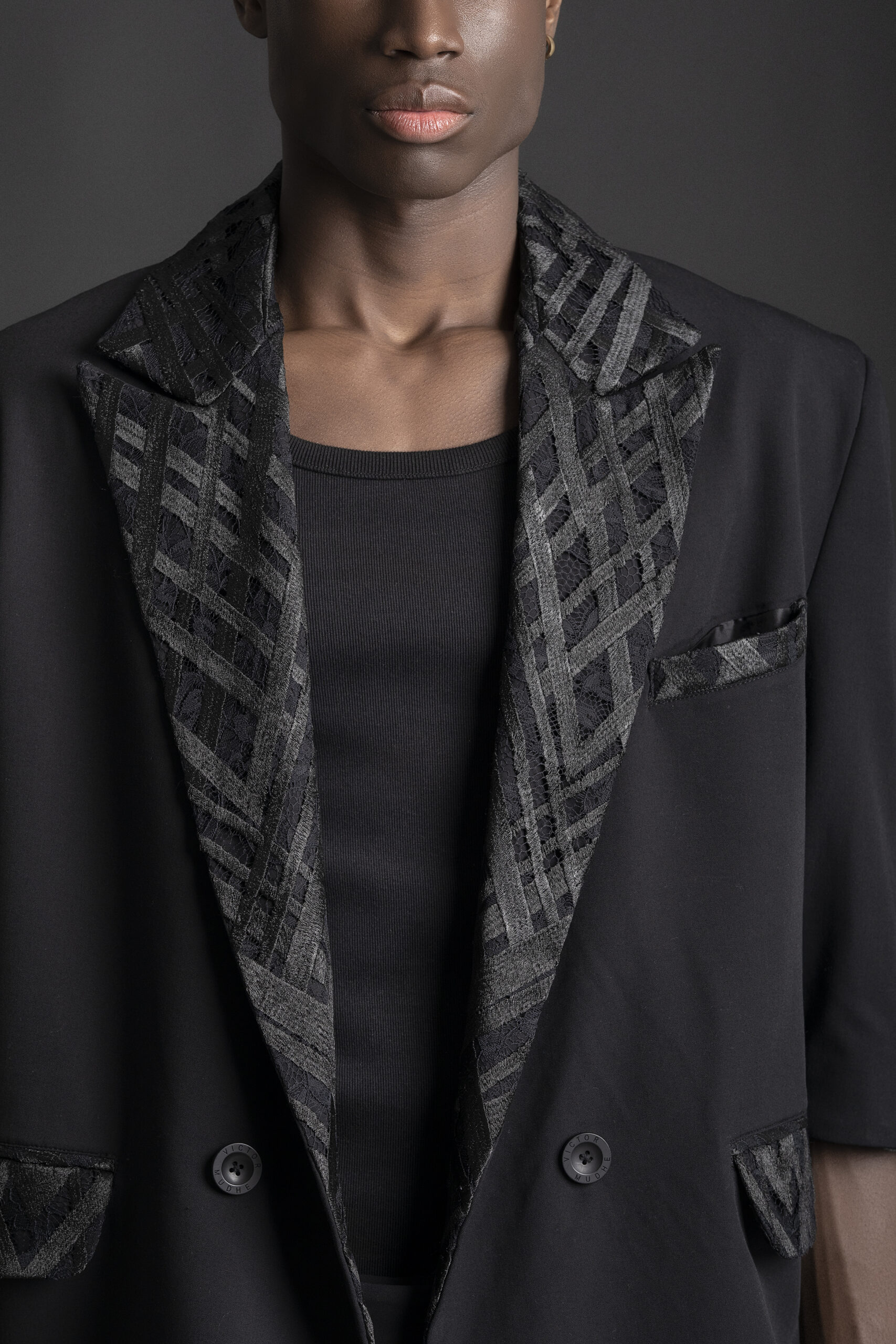 Experience unparalleled luxury with this black lace offense suit blazer. The design features a chest welt pocket, double-breasted button fastening, and two front flaps. Delicate lace details elevate the blazer to a new level of sophistication, making it the perfect choice for any formal occasion.