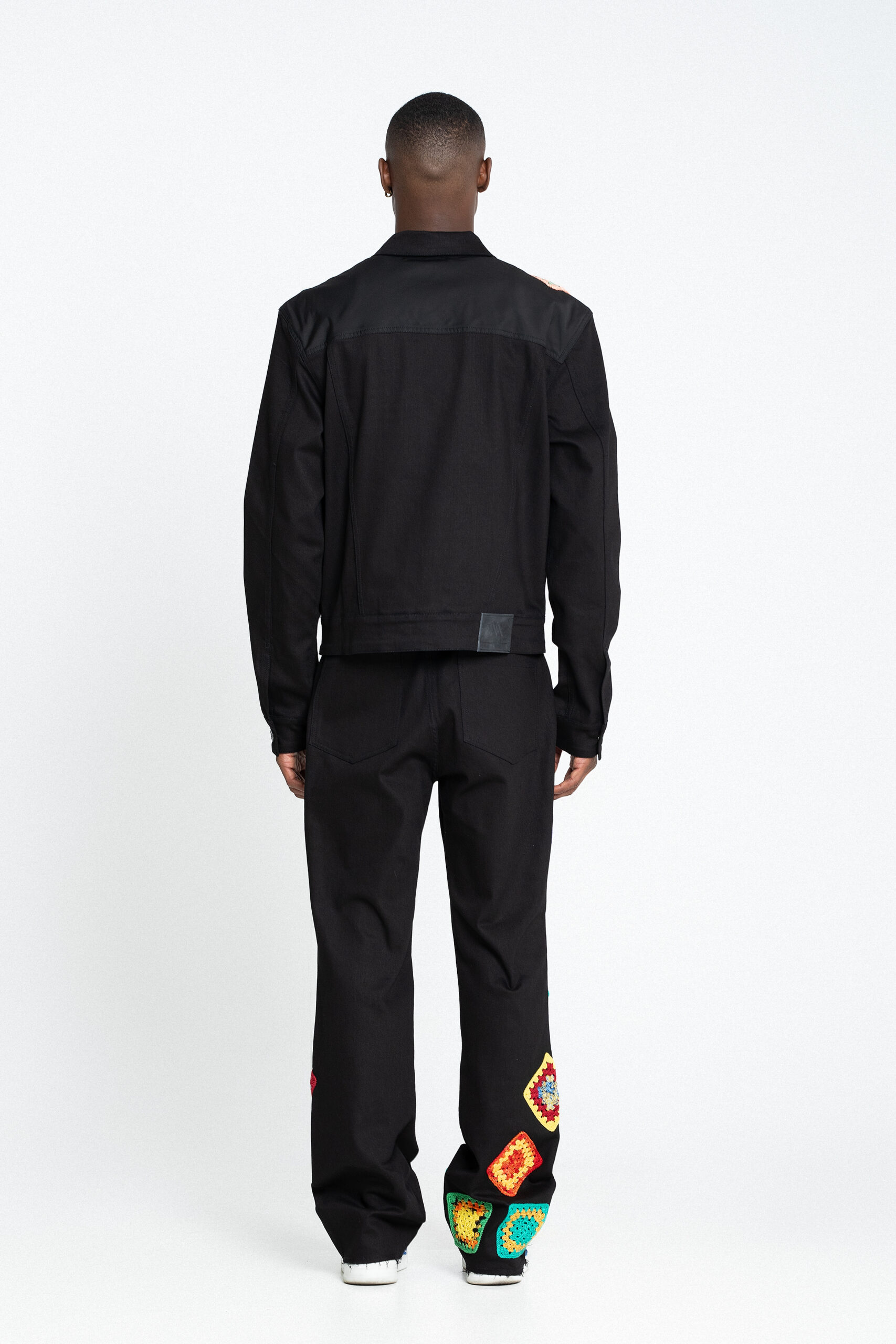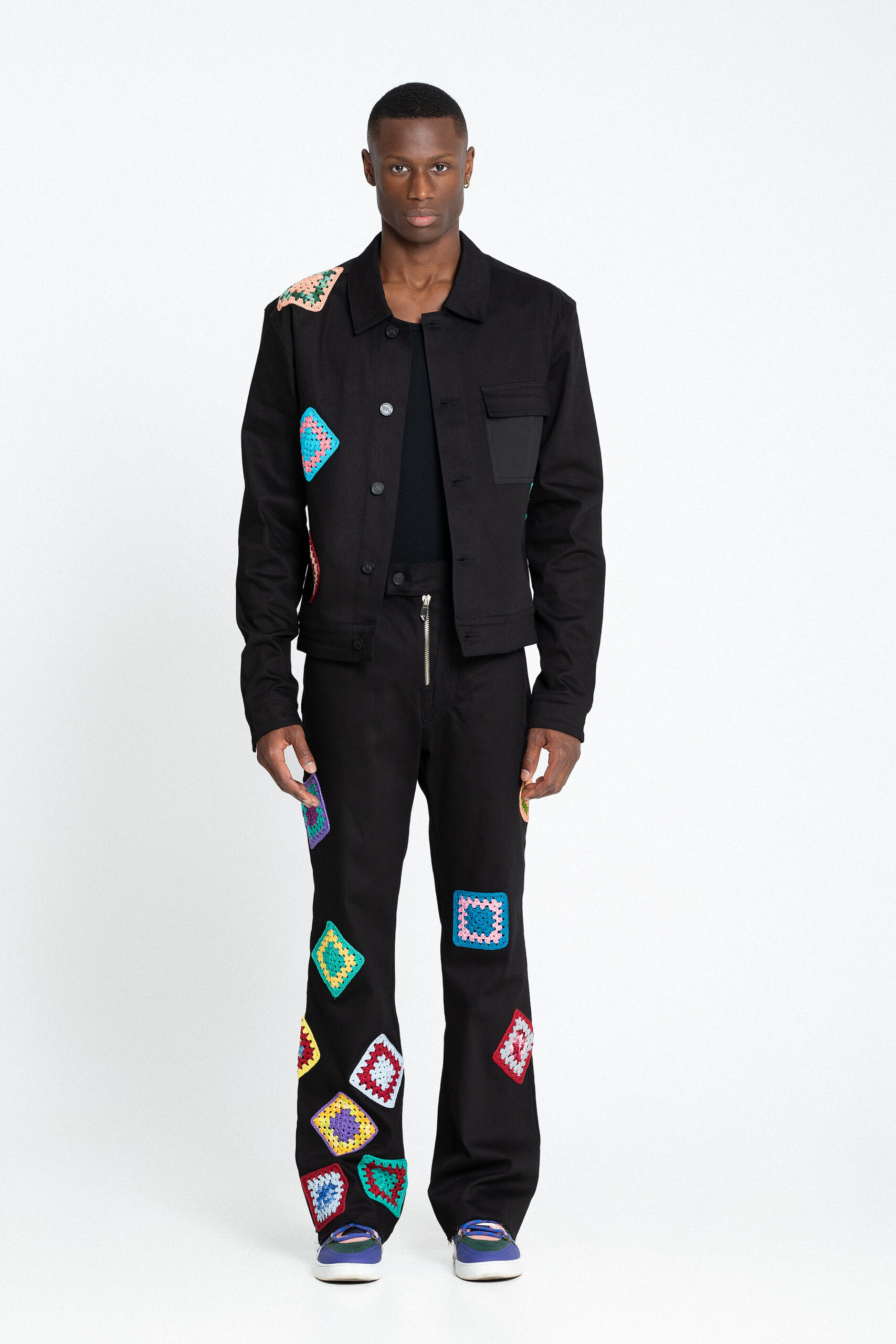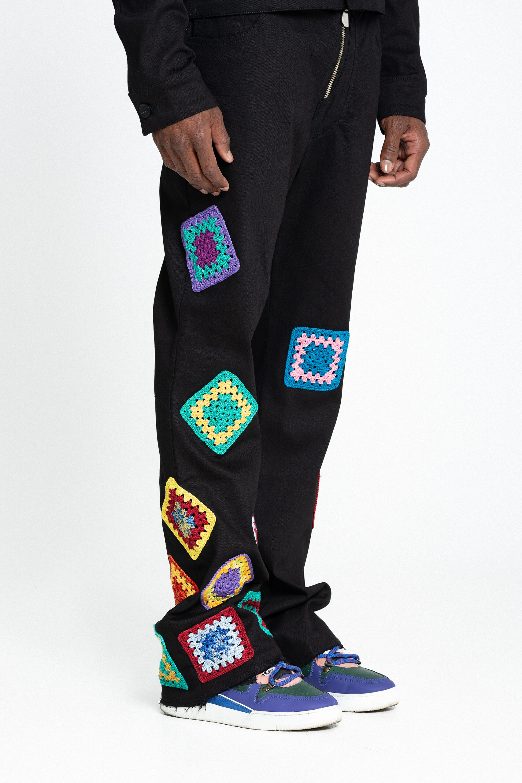 A black cotton pant that blends style and comfort. Equipped with belt loops, it features a front button and zip fastening for a secure fit. Two rounded pockets on the sides provide convenience, while two rear pockets add a touch of detail. With slightly flared legs, the pants showcase a handcrafted crochet application delicately worked throughout, offering an artisanal charm that elevates the look.